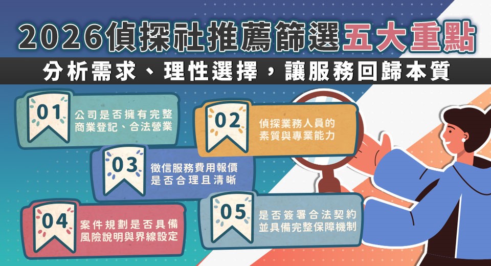 選擇徵信社,與其說是在比較服務內容,不如說是在評估一整套制度是否足以承接風險。對多數委託人而言,真正重要的並非調查技術本身,而是整個過程是否讓人感到安心,並且在出現問題時有明確的保障機制。綜合近年實務觀察,以下五個面向,正是2026年篩選優質徵信社時,最應優先確認的核心條件。